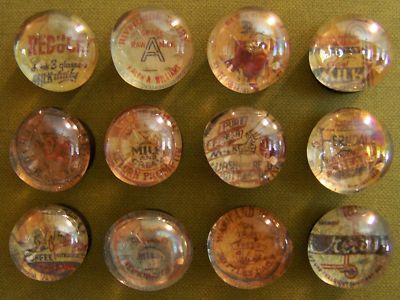Set of 12 Asst. Handmade Nostalgic Milk Cap Advertisements Glass Marble Magnets