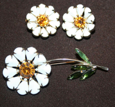 Vintage Milk Glass Rhinestone Flower Brooch set WEISS