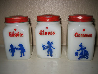 Title (ebay affiliate link): Three Vintage Dutch Themed Milk Glass Spice Jars Shakers Red Tops