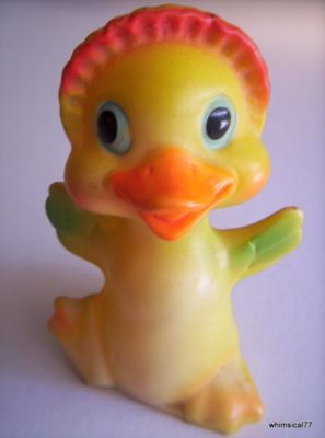 Title (ebay affiliate link): Antique Rubber Duck Squeeze Toy w/ Happy Feet Flapping Wings & Bonnet