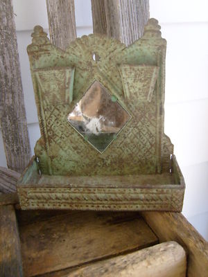 Primitive Antique Pressed Tin Match Safe Comb Holder Mirror