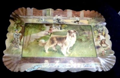 Antique 1879 Advertising tin Tip change Tray Collie Children Dogs