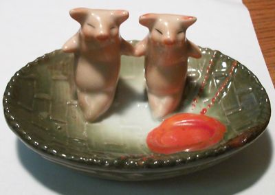 Title (ebay affiliate link): EARLY VINTAGE GERMAN, TWO PINK PIGS ON AN OPEN BASKET, LOT B LOOK!!