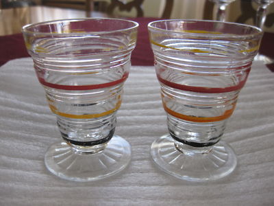 Title (ebay affiliate link): set of 2 small 4 color banded Anchor Hocking footed juice glasses
