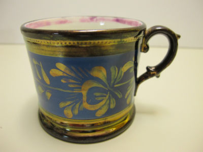 Title (ebay affiliate link): 19TH C. COPPER LUSTER MUG WITH HAND-PAINTED FLOWERS AND LEAVES ON A COBALT BAND.
