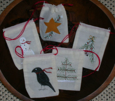 Title (ebay affiliate link): Primitive CHRISTMAS Gift Bags 5 Cloth Potpourri Bags Handpainted Star Crow Tree