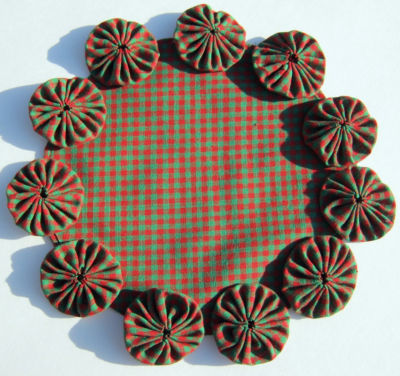 Title (ebay affiliate link): Country Christmas Green & Homespun YoYo Candle Mat Doily or Centerpiece