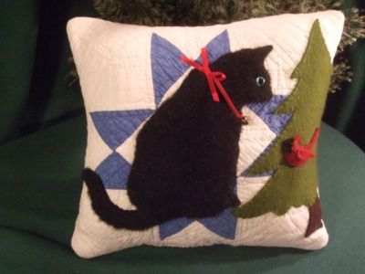 Title (ebay affiliate link): Antique Primitive Folk Art "Black Cat & Bird" Quilt Pillow