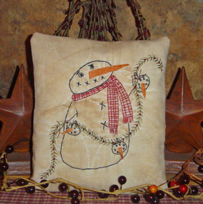 Title (ebay affiliate link): ~SNOWMAN WITH SNOWMAN GARLAND~ Primitive Stitchery Sampler Pillow