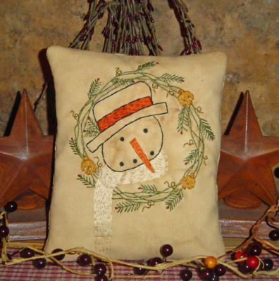 Title (ebay affiliate link): ~SNOWMAN AND WINTER WREATH~Primitive Stitchery Sampler Pillow