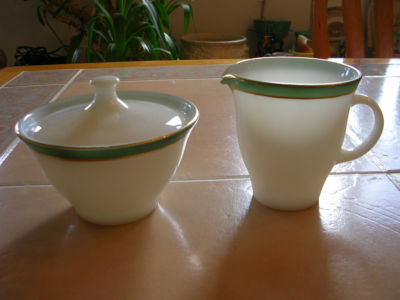 Title (ebay affiliate link): VINTAGE PYREX GREEN BAND STRIPE GOLD MILK GLASS SUGAR BOWL & CREAMER PITCHER