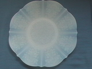 Title (ebay affiliate link): VINTAGE 1930'S OPAQUE WHITE MILK GLASS PLATE, IRIDESCENT, BLUE ACCENTS, 10-5/8"