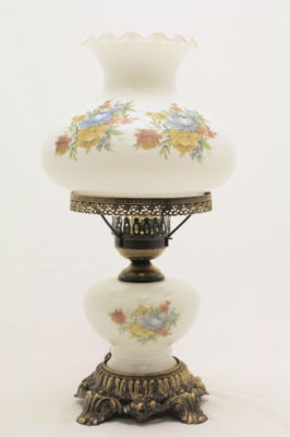 VINTAGE HURRICANE MILK GLASS LAMP w/ FLOWERS