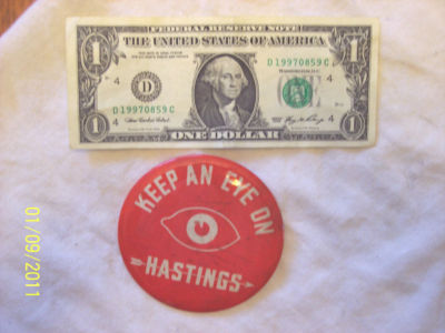 VINTAGE "KEEP AN EYE ON HASTINGS" 3 1/2" PINEBACK BUTTON PROMOTING HASTINGS OIL?