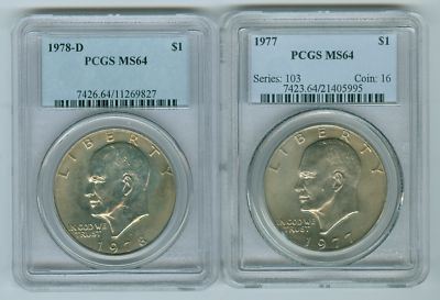 Title (ebay affiliate link): 1977 & 1978-D NEAR GEM BU EISENHOWER DUO - PCGS MS-64