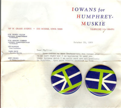 1968 IOWANS FOR HUMPHREY & MUSKIE MADE CAMPAIGN BUTTONS w/ LETTER