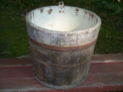 Title (ebay affiliate link): AAFA PRIMITIVE WOODEN WHITE WASHED SAP BUCKET VERMONT TYPE
