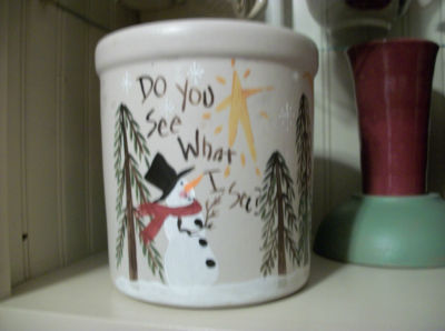 Title (ebay affiliate link): Stoneware crock hand painted with snowman, pine trees-must see