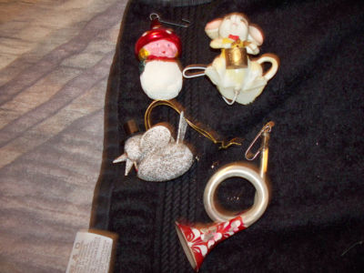 Title (ebay affiliate link): 4 VINTAGE CHRISTMAS ORNAMENTS-TRUMPHET-MOUSE-MORE