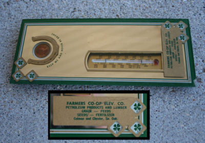 Title (ebay affiliate link): Colman Chester SD Penny Glass Thermometer Shamrock Lucky Horseshoe Farmers Co-op