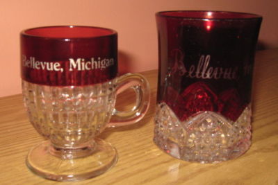 TWO (2) Bellevue, Michigan Souvenir Cranberry Ruby Glass
