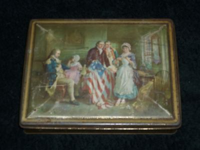 Title (ebay affiliate link): Antique Vintage Old Tindeco Tin Early American Historical Flag Scene