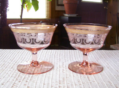 Title (ebay affiliate link): Two Lovely Pink Depression Glass Etched w/Gold Band Footed Sherbets