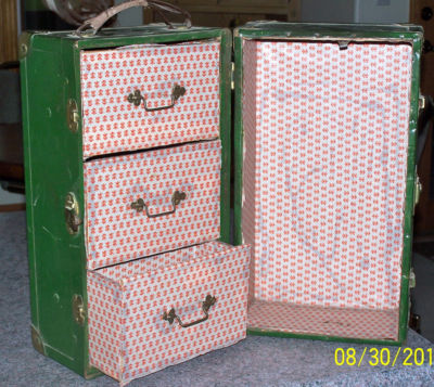 ANTIQUE DOLL STEAMER TRUNK, Metal, 3 drawers
