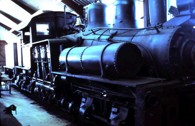 Original slide, West Side shay #7 in the shop, Tuolmne, Calif., 1981