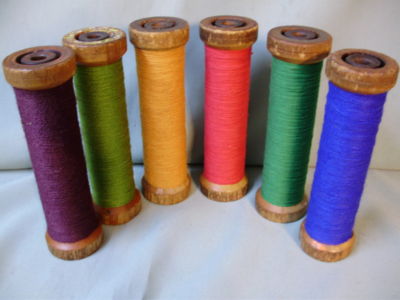 Title (ebay affiliate link): 6 VINTAGE WOOD TEXTILE MILL SPOOLS, BOBBINS WITH YARN