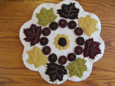 Title (ebay affiliate link): Handmade Fall Autumn Penny Rug Candle Mat Sunflower/ Leaves and Pennies
