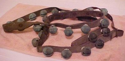 Title (ebay affiliate link): VINTAGE METAL SLEIGH DOOR BELL SET PRIMITIVE BELLS & LEATHER HARNESS EARLY 1900s