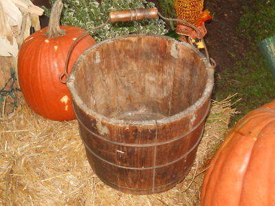 Title (ebay affiliate link): ANTIQUE PRIMITIVE OAK WOODEN BUCKET PAIL w BAIL HANDLE OLD FARM