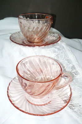 Title (ebay affiliate link): 2 CUPS SAUCERS DEPRESSION PINK SWIRL ROSALINE GLASS ARCOROC FRANCE