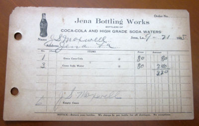 1925 Coca Cola Bottlers Invoice Jena Bottling Works - Jena LA / Coke Bottle