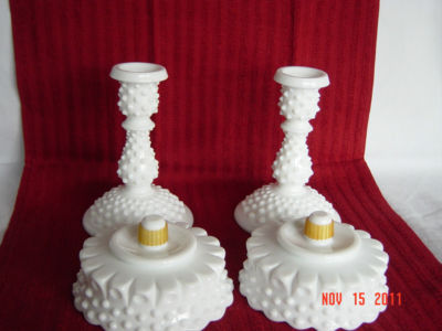 Title (ebay affiliate link): FENTON MILK GLASS HOBNAIL 2 IN 1 TALL PEDESTAL CANDLE HOLDERS EC