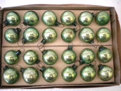 Title (ebay affiliate link): 24 VINTAGE MINIATURE GREEN SHINY BRITE FEATHER TREE GLASS ORNAMENTS IN BOX ~(#7)