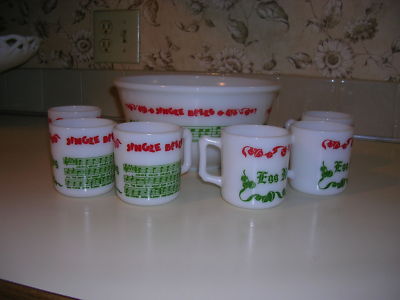 HAZEL ATLAS JINGLE BELLS MILK GLASS EGG NOG PUNCH BOWL & CUPS SET