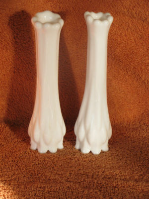 Title (ebay affiliate link): 2 Beautiful White Milk Glass Bud Vases Flower Beautiful Unique Design 6" tall