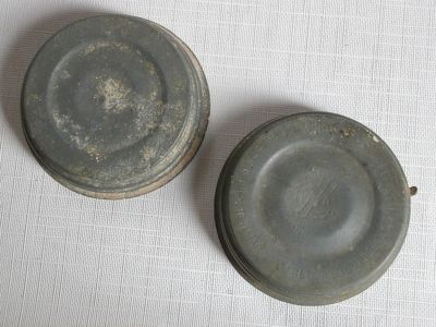 Title (ebay affiliate link): 2 CFJCo ZINC LIDS WITH CFJ MILKGLASS INSERTS ONE LUGGED & DEBOSSED ONE NOT