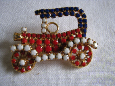 Title (ebay affiliate link): VINTAGE MILK GLASS RED AND BLUE RHINESTONES MODEL-T GOLDTONE BROOCH PIN
