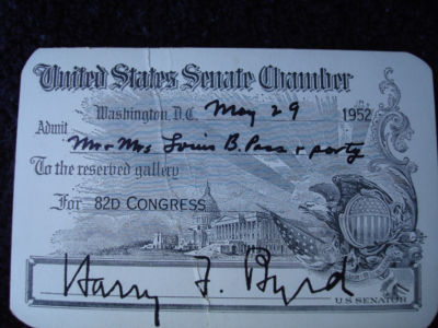 Title (ebay affiliate link): PASS FOR THE U.S. SENATE CHAMBERS MAY 29, 1952 SIGNED BY HARRY F. BYRD