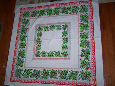Title (ebay affiliate link): VINTAGE LINEN FESTIVE CHRISTMAS SQUARE TABLECLOTH w/ HOLLY BERRIES