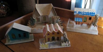 Title (ebay affiliate link): Vintage Lot 4 Christmas Putz Village Mica Houses Church Sponge Bottle Brush Tree