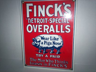 VINTAGE LOOK FINCK'S DETROIT SPECIAL OVERALLS PORCELAIN SIGN