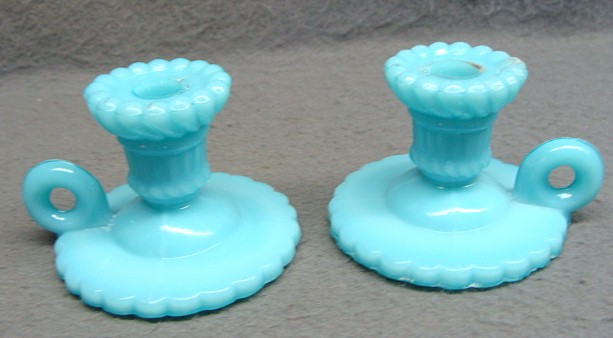 Pair Blue Milk Glass Miniature Dolls Swirl Candlestick