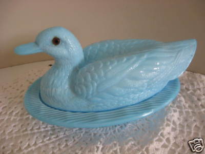 BLUE MILK GLASS DUCK on Nesting Dish--Tiffin--