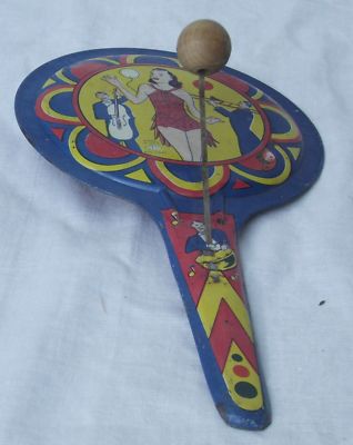 Title (ebay affiliate link): 1950s Vintage Tin Metal Noise Maker Antique Toy Paddle with Handle Wood Clapper