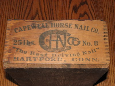 Title (ebay affiliate link): VINTAGE WOOD STORAGE BOX CAPEWELL HORSE NAIL CO. HARTFORD CONN.