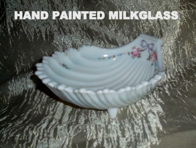 Title (ebay affiliate link): BEAUTIFUL VINTAGE HAND PAINTED MILK GLASS FOOTED SHELL SOAP/CANDY/TRINKET DISH